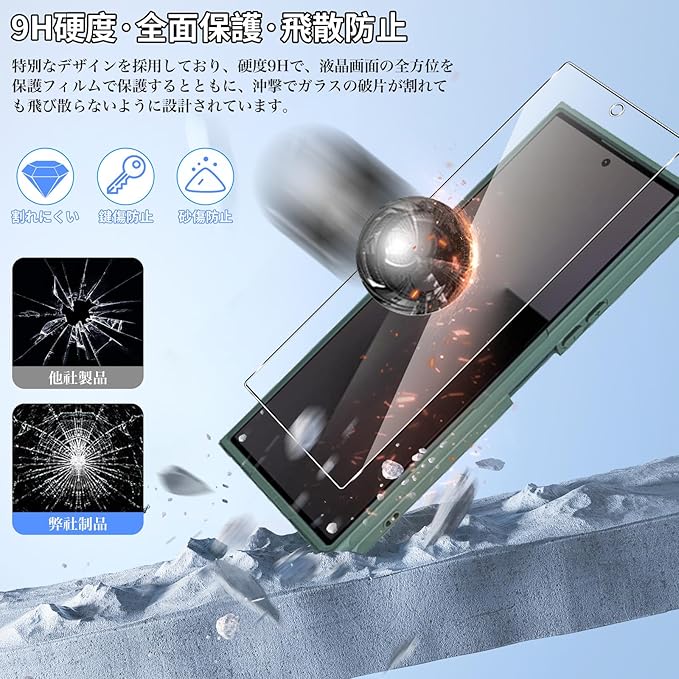 【ガラスフィルム付きの心配りある保護】日本製旭硝子材料を採用し、外部からの沖撃に強く、スマートフォンの画面への沖撃を防ぎます。また、特殊な飛散防止設計により、フィルムが割れても飛散せず、高い安全性を実現しています。スマートフォンを全面的に保護し、液晶画面の安全を守り、長く安心してお使いいただけます。