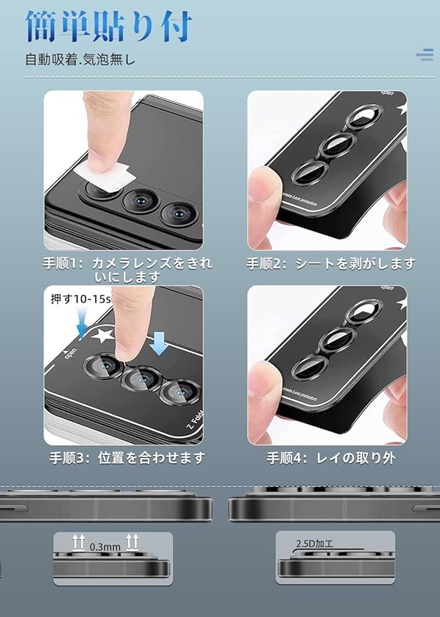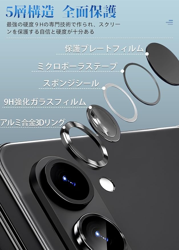 【高級感漂う単体仕上げ】Galaxy Z Fold 7 SC-55E カメラフィルムGalaxy Z Fold 7の独立型カメラために生まれた新作。フィルム全周はアルミ合金製リングとの融合で、本体のお洒落を向上しながら、ギャラクシーZ Fold 7本体の色味にもぴったり、抜群な一体感、上品な見栄えでカメラの魅力を格段にアップ。それに薄0.3mmのデザインと0.5gの軽さで、分厚さやケースと干渉などの悩みは全くない、いつでも楽に使える。