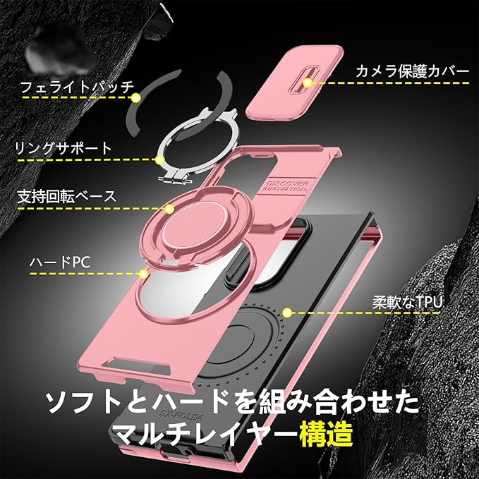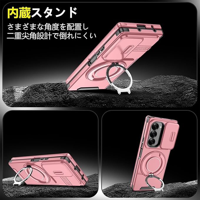 対応 Galaxy Z Fold7 用 ケース スタンド付き リング付き 耐衝撃 レンズ保護 スライドカメラカバー TPU+PC 軽量 滑り止め 落下保護 スタンド機能 車載ホルダー対応 ギャラクシー Z フォールド7 5G 携帯ケース ピンク R-LK-Fold7-05-CP