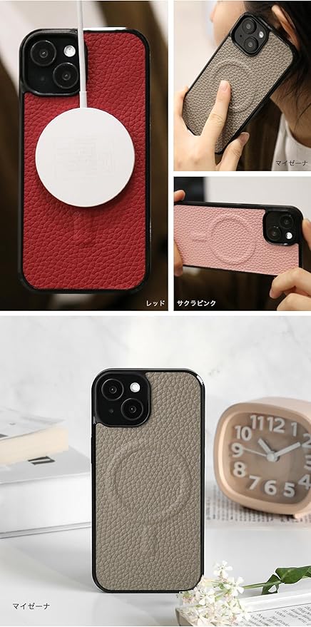【仕様】ケース背面にMagSafe用マグネットリングが内蔵されているので、MagSafe充電器やMagSafe対応アクセサリーを装着することが可能です。ケース本体は耐候性や耐熱性に優れたポリカーボネートを採用し、高品質の素材でスマートフォン本体をしっかり保護しています。側面は柔軟性が高く傷に強いTPUを使用。ボタンを覆うフルカバーの仕様になっており、両サイドにグリップ加工が施されているので持ちやすく滑りにくくなっています。背面はシュリンクレザーを丁寧に貼り込み仕上げています。