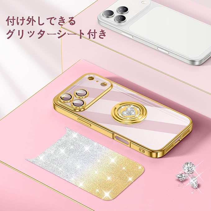 【注意事項】本製品は粘着式デザインのため、MagSafeやワイヤレス充電技術には対応しておりません。iPhone 17 Pro Max 用電話ケース x 1、グリッターカードストック x 1、ブレスレット x 1、スペーサー x 1、レンズプロテクター x 1が含まれています。