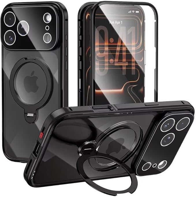 【スタンド機能付き・360 定点回転】MagSafe対応 iPhone 17 Pro Max 用 ケース クリア ロック付き 9H強化ガラス PC背面 一体型レンズ保護 両面 アルミバンパー メタルフレーム ワイヤレス充電対応 アイホン17プロマックス 用 カバー スマホケース,ブラック