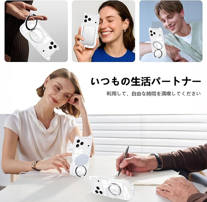 iPhone 17 Pro Max 用 ケース クリア リング付き 隠しスタンド 猫耳 ネコミミ アイフォン17 pro max ケース MagSafe対応 360度回転スタンド リング付き iphone 17 pro maxスマホケース TPU 縦横両対応 多機能 マグネット搭載 車載対応 可愛い 猫柄 カバー 韓国 おしゃれ アニメ 耐衝撃 黄変なし 米軍MIL規格 全面保護(ホワイト)