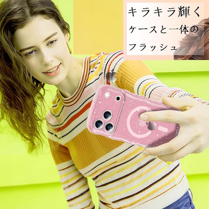 スマホケース 対応 iPhone 17 Pro Max ケース MagSafe対応 クリア 透明 キラキラ フラッシュ ウェーブエッジ 波形 おしゃれ かわいい 高級なTPU素材 TPU+PCパネル ハード 保護カバー 衝撃吸収 ストラップホール付き アイフォン17プロマックス 携帯電話カバー (ピンク, iPhone17 Pro Max)