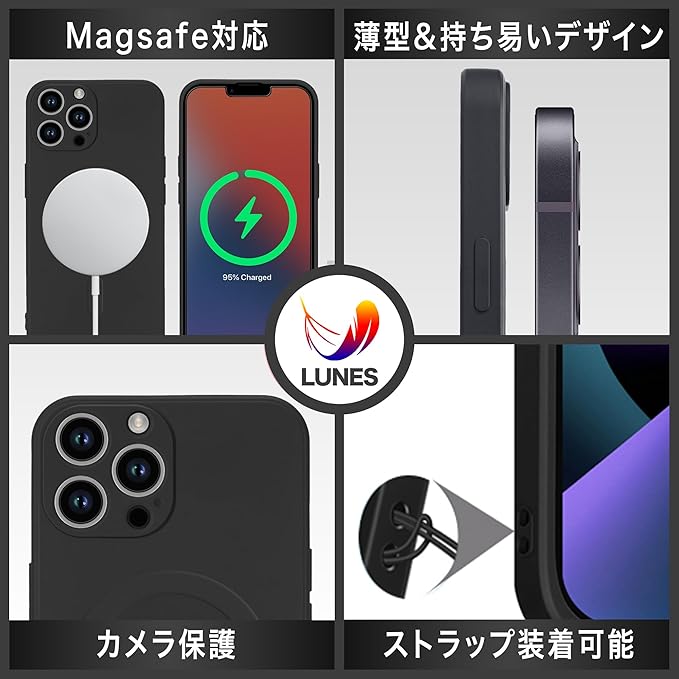 [強力な磁力] LUNES iPhone 13 Pro Max 用 マグセーフ対応ケースは内部38個の強力なN52マグネットを搭載しています。吸着力が優れておりいくら振っても落ちない。Magsafe対応スタンド、リング、ワイヤレス充電、、など様々マグセーフ対応アクセサリーが利用可能です。