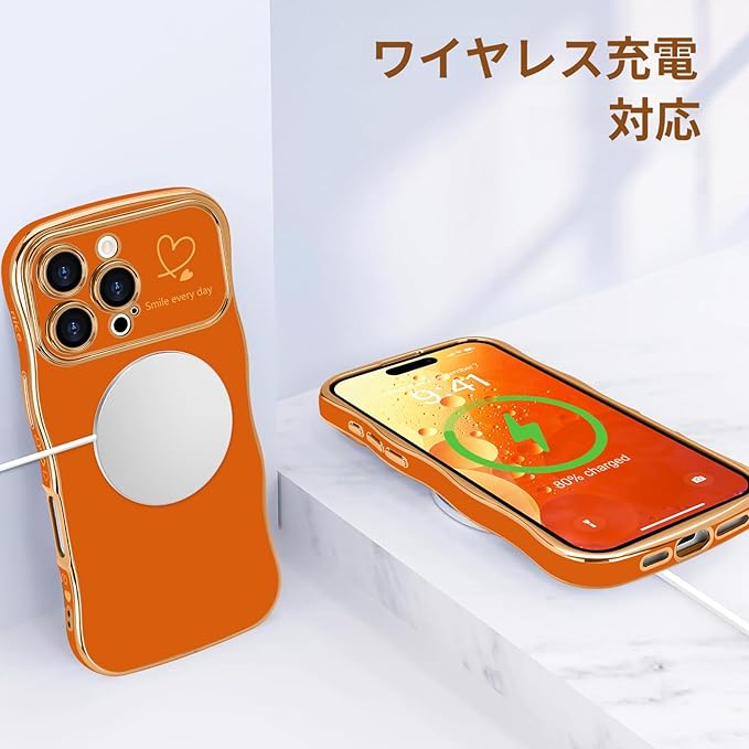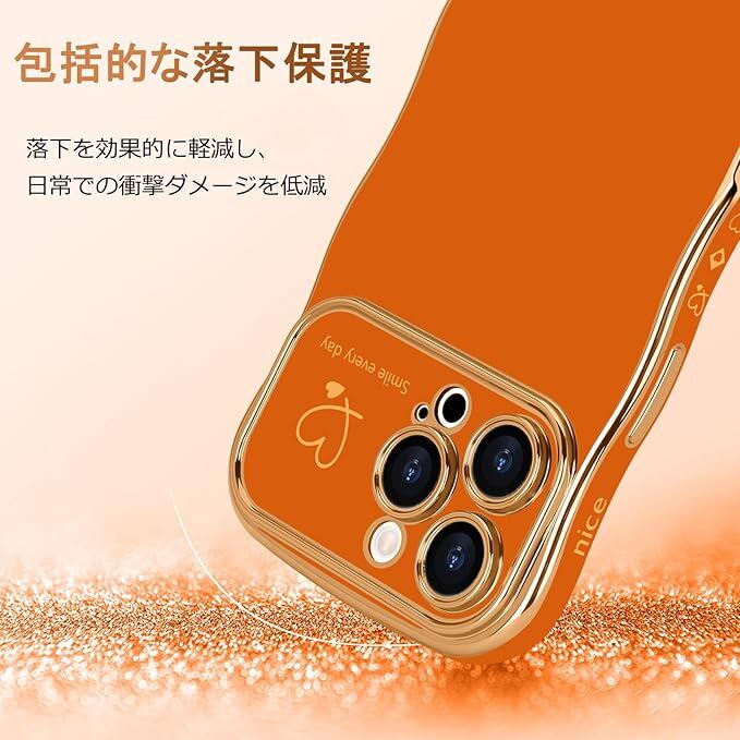 LCHULLE iPhone 16 Pro Max 用 ケース ウェーブ TPUカバー おしゃれ 滑り止め 韓国 可愛い 薄型 軽量 耐衝撃 女の子 人気 レンズを保護 ハート柄 ワイヤレス充電対応 ストラップホール付き アイフォン 16 Pro Max 用 スマホケース (オレンジ)