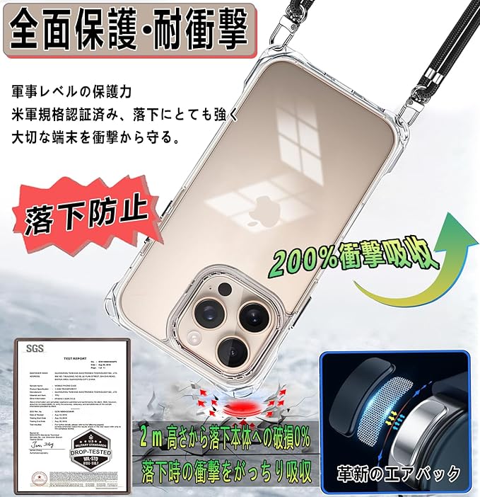 【耐衝撃 & 米軍MIL規格の取得】その耐衝撃性能は第三者機関の試験による米軍MIL規格をクリアするほど高いことが証明されております。iPhone 16 Pro Max ケースの四隅部分に"衝撃吸収テクノロジー"を採用し、これにより角からの衝撃を受けてもその隙間がクッションの様に本体への衝撃を吸収します。万が一スマホを落としてしまった場合でも、落下時のダメージを最小限に抑えることが可能となっており。