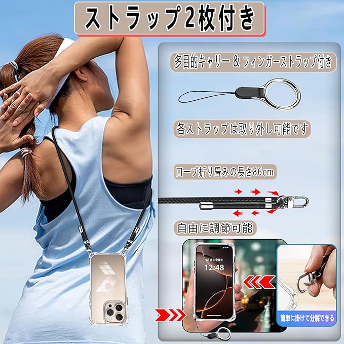 【ストラップ2枚付き & 両手を解き放つ & ワイヤレス充電対応】本iPhone 16 Pro Max 6.9''(2024)対応ケースにはフィンガーストラップとネックストラップが付属します(フィンガーストラップ長さ:10cm、ネックストラップ装着時の最大調整長:86cm。)電話ケースの特別な四隅のデザインにより、電話を縦または横に肩に掛けることができ、ストラップはいつでも調整および取り外しできます。このアクセサリーはファッションだけでなく、通常のストラップよりも快適で実用的です。 作業、旅行、出張、ショピング、散歩、コンサート、パーティーに最適です。(あなたは受け取るでしょう:1x iPhone16 Pro Max 対応 ケース + 1x フィンガーストラップ+ 1x ネックストラップ)