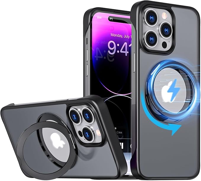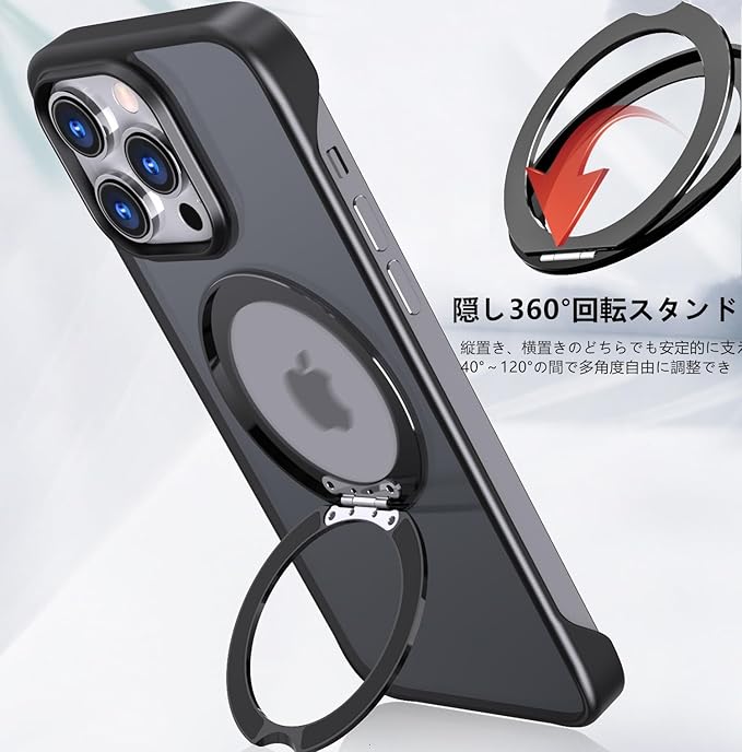 iPhone 15 Pro Max 用 ケース 【多機能360 回転 スタンド】【MagSafe対応・隠しスタンド】丸型スタンド付き 半透明 マグネット搭載 ワイアレス充電対応 【フレームレスデザイン】縦横両対応 角度調整 アイフォン 15promax 用 ケース(iPhone 15 Pro Max, 黒)