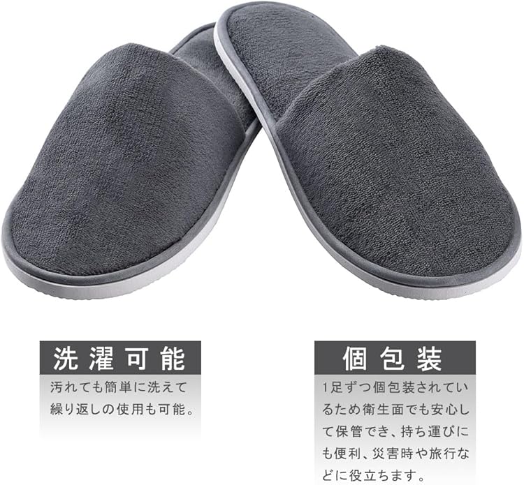 来客用に使えるものが欲しい方は、この高級感のあるベルベットをおすすめします。普段使いできそうなほど見た目がしっかりしており、肌触りも良好。底も厚めで使い捨てっぽさがありません。 個別包装されていて保管しやすく、携帯にも便利。必要なときにバッグにサッと入れて持ち出すことができます。ちなみに、旅行や出張などの際、飛行機だけでなくホテルでも使うというような場合は、収納袋付きで何度か履けますよ。 底面にEVAシートを取り付けて滑りを防止、 スリッパの底面に凹凸付きの滑り防止EVAシートを採用し、フローリングの上も歩きやすいです。