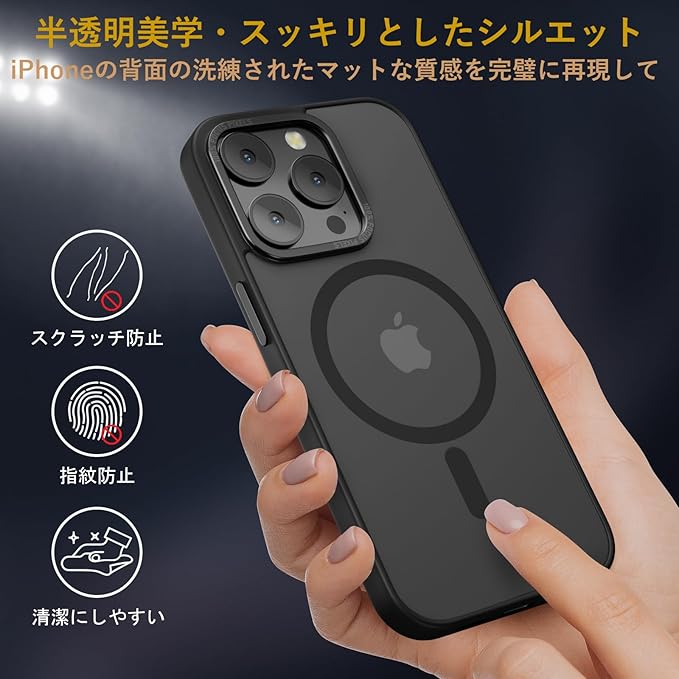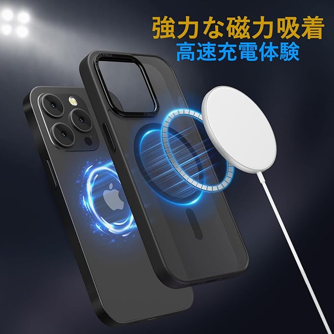【米軍MIL規格・Magsafe対応】iPhone 14 Pro Max 用 ケース 半透明 マグネット搭載 耐衝撃 黄変防止 耐久性 磁力強い 高速充電速度 ワイヤレス充電 磁気スマホケース (ブラック)
