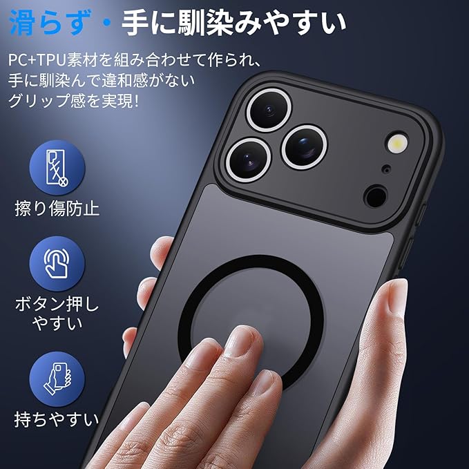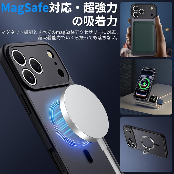 【MagSafe対応で一瞬高速充電!】iphone 17 pro max ケースのバックパネルに38個の強力なN52マグネットを搭載し、振っても安定感抜群の高速充電を実現!充電しながらゲームも楽しめ、ワイヤレス充電や各種MagSafe対応アクセサリーにもピッタリ対応しています。※予めご了承ください:磁力があるため、携帯本体付属のタッチペンが磁力干渉を起こして使えなくなる可能です。また、電子決済の反応も弱くなる可能です。