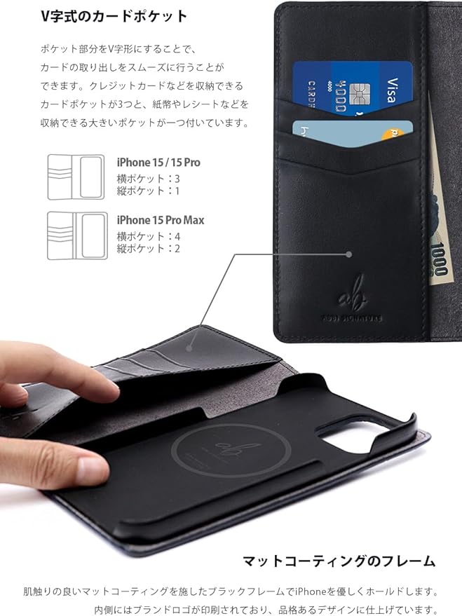 ABBI SIGNATURE iPhone 15 Pro Max 用 ケース 日本製 手帳型 本革 LIPARI イタリアンレザー ダイアリーケース MagSafe対応 [ クロコダイル 型押しレザー ハンドメイド 耐久性 レザーケース V字式カードポケット ワイヤレス充電 ] アイフォンケース アップル アイフォンケース 横開き ABS26196i15PM ブラック 【国内正規品】