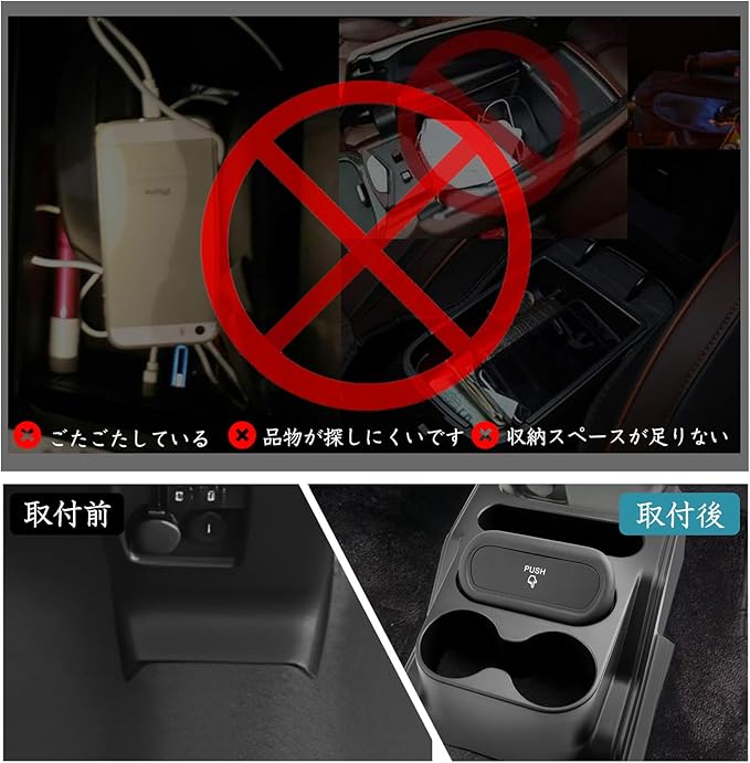 【多機能設計】カップホルダー+収納ボックス+ミニゴミ箱の便利な三位一体デザイン。飲み物、スマホ、小銭、駐車券カード、コイン、メガネ、クレジットカードや鍵などの小物をすっきり収納可能。小物関係の収納には最高です。さらにゴミ箱付きで、車内を清潔に保つ習慣が自然に身につきます。