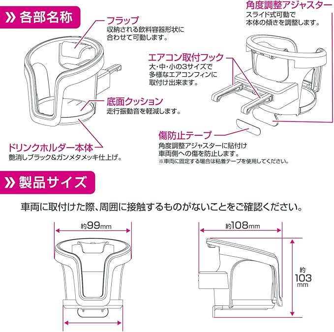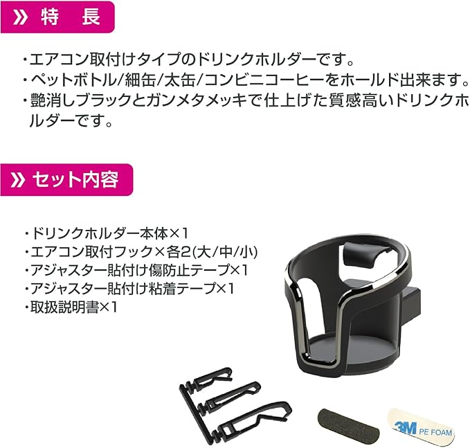 細缶/太缶/ペットボトル/600mlペットボトル対応。質感高い本体ラバー調塗装/ガンメタ加飾パーツ。エアコン取付。大/中/小 3サイズのフックでそれぞれにエアコンフィンに合わせたサイズの選択が可能。