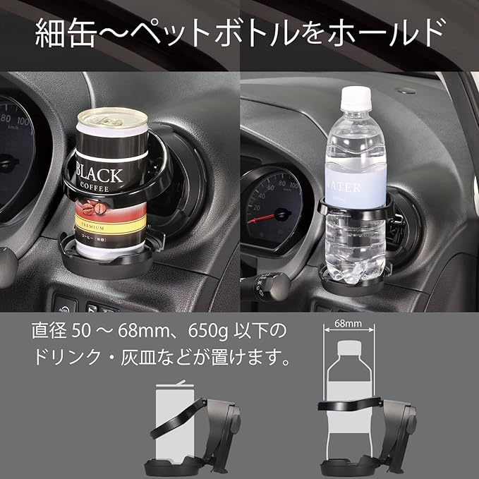 細缶(直径52mm)~500mlペットボトル(直径68mmまで)、重さ650g以下の飲料を置くことができます。