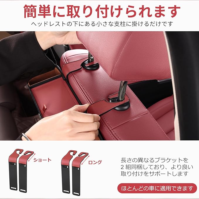 車载レザー製多機能後部座席・リアシート用ドリンクホルダー(ティッシュボックスとフック付き),ヘッドレストカップホルダー収納ボックス、車の旅行用収納用品 (赤色)