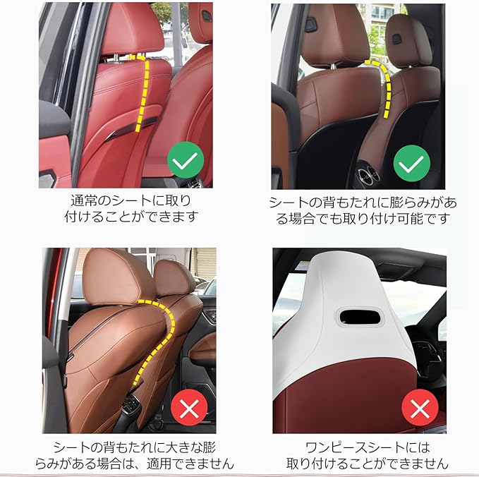 ✅簡単取り付け ** 4つのヘッドレストフックでフロントシート背面に確実に固定。わずか数分で車内をアップグレード。※一部シートモデルは非対応(詳細は製品画像参照)。
