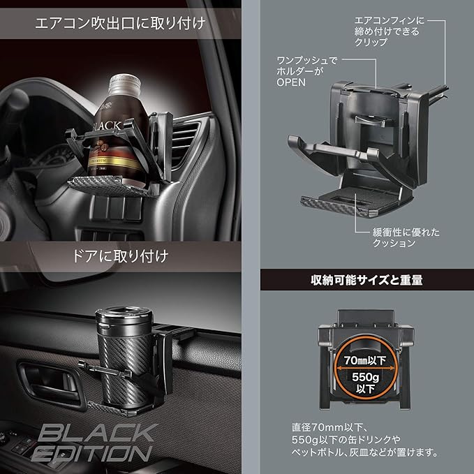 本製品はエアコン吹き出し口とドアに取り付けることができるドリンクホルダーです。使用しないときには畳んでおけるスリム設計になっています。