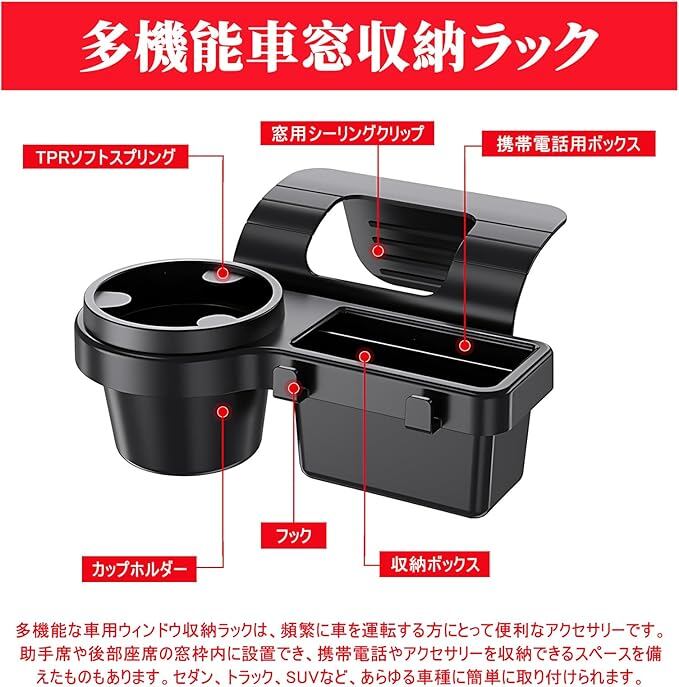 車用 多機能 カップホルダー 収納ボックス スマホスタンド 鍵ホルダー付き ドアサイド取付 軽量ABS樹脂製 コンパクト設計 窓の隙間差込タイプ ドリンクホルダー 小物入れ 車内整理 オーガナイザー SUV トラック 普通車 全車種対応