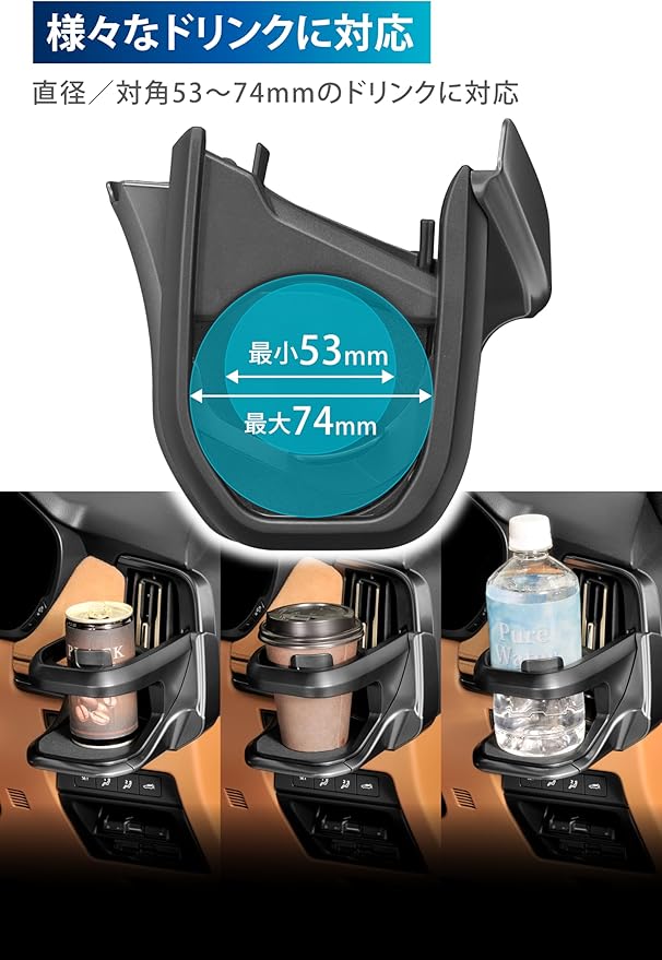 上から見た時に【直径】もしくは【対角の長さ】が53~74mmのドリンク容器に対応しています。(底から上部にかけて広がるカフェカップやチルドカップ等の場合、底から79mmの位置でのサイズが74mm以下であること。) また、細い缶もホールドできるようにするためホルダー内側にアジャスターが付いています。