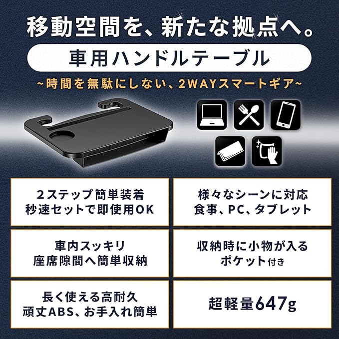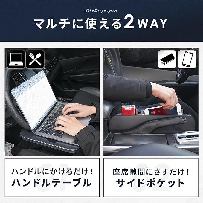 車用 ハンドルテーブル 2WAY 運転席専用 車内テーブル 車載デスク シートサイドポケット付 ノートPC作業 食事 車中泊に最適 取り付け簡単 耐水性 軽量 ドリンクホルダー付
