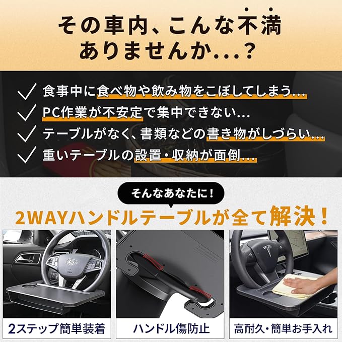 【車内でPC作業や食事が快適】ハンドルに取り付けるだけで、ノートPC作業・食事・書き物がしやすい安定したテーブルに変身。休憩時間や車中泊など、車内での作業効率が大幅UP。