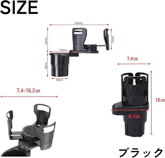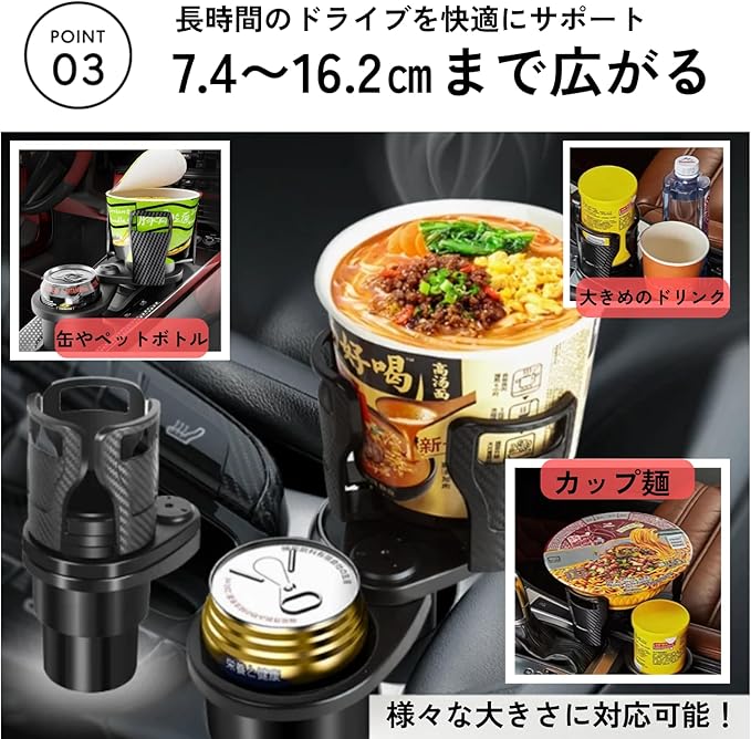 【調節可能で多用途】ホルダーのサイズは直径7.2~16.2cmまで調節可能で、大きめのボトルやインスタントラーメンにも対応。ドリンク以外にもスマホや小物を収納可能な多機能設計です。回転式スロットで手が届きやすい位置に調整でき、長時間のドライブを快適にサポートします。