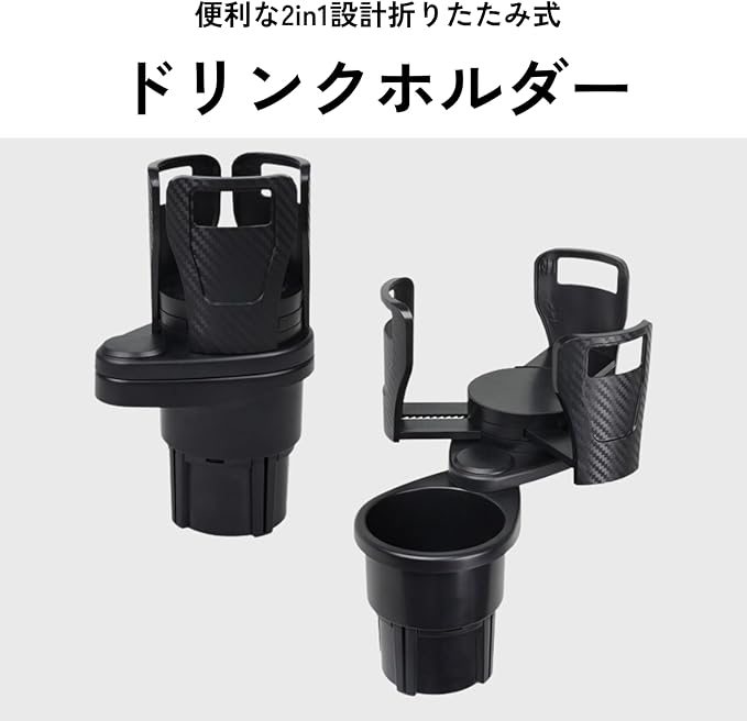 " 【便利な2in1設計折りたたみ式ドリンクホルダー】車内のスペースを効率的に活用。360度回転可能で、1つのホルダーが2つに展開。飲み物やカップ麺をしっかりと固定しつつ、省スペース設計で快適な車内環境を提供します。取り付けも簡単で、工具不要でどなたでもすぐに使えます。