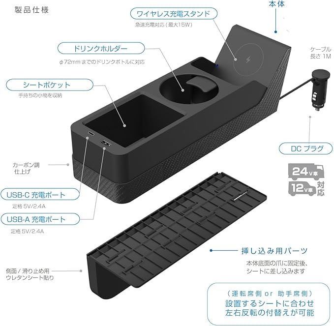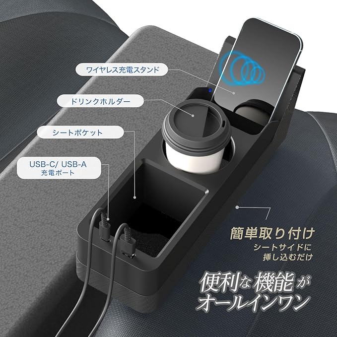 ●シート横に便利な収納ポケット&ドリンクホルダーを追加できる、ワイヤレス充電付 オーガナイザー。