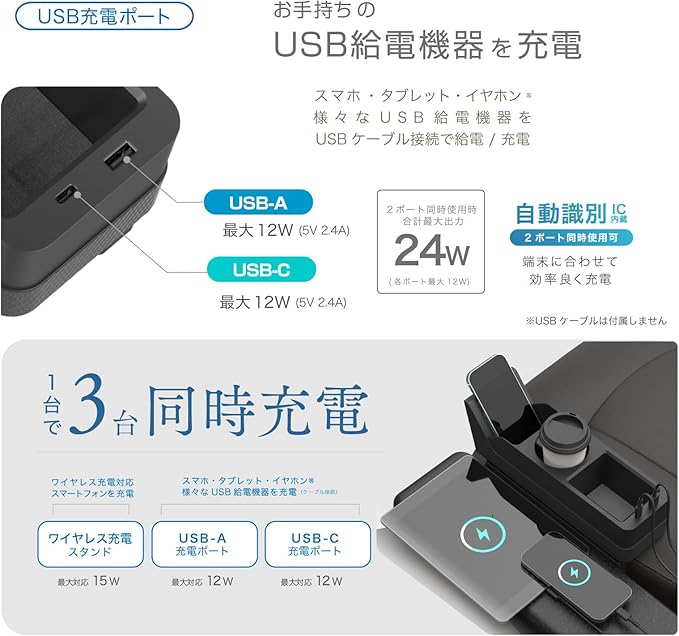 合計4.8Aの充電が可能なType-C/USB-A 2ポート搭載。接続機器を自動的に識別して最適な電流で充電する自動判定ICを内蔵