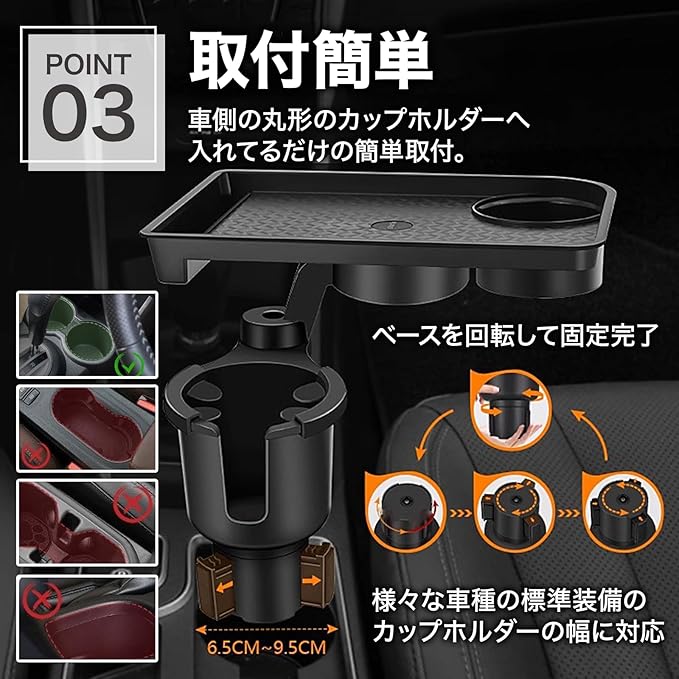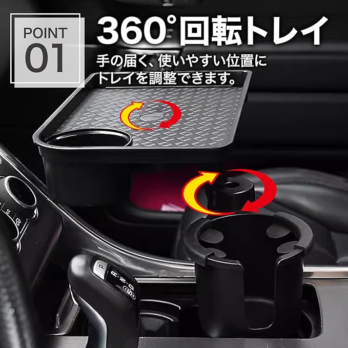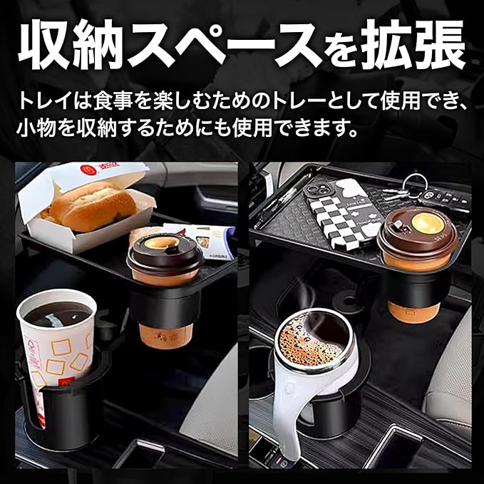 【トレイ付きドリンクホルダー】トレイ付きの車用ドリンクホルダーです。トレイが付いている為多くの収納スペースがあり、カップだけでなく、食べ物、飲み物、スマホなどいろんな小さい雑貨にも対応でき、車内スペースが節約ができます
