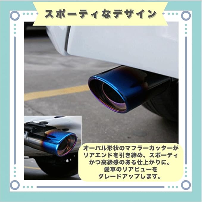 【錆びにくい高品質素材】高品質のステンレス素材にメッキ加工を施し、優れた耐久性と耐食性を実現。水抜き穴があり、湿気を逃がし、マフラーカッターのサビや劣化を防ぎます。【初心者でも簡単取付】純正マフラーに被せてボルトを締めるだけで、誰でも簡単に装着できます。DIY初心者でも簡単にカスタマイズ可能です。【スポーティなデザイン】オーバル形状のマフラーカッターがリアエンドを引き締め、スポーティかつ高級感のある仕上がりに。愛車のリアビューをグレードアップします。【どんな車にもマッチ】汎用設計で幅広いマフラーサイズに対応。排気量1.0L~2.0Lの幅広い車種に装着可能です。汎用タイプで、ほとんどの車にフィットします。