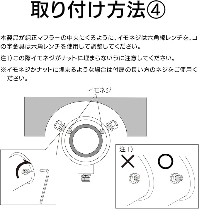 インナーメッシュパイプの後端に絞り加工を入れ、スポーティー感を強調するとともに、より取り付けやすくなりました。高硬度ステンレス(SUS304)使用で軽量で錆びにくいマフラーカッターです。先端のカット&ロール加工により高級感を演出します。特殊ネジ(イモネジ)2本とコの字金具で取り付けるので確実な取り付けが可能です。純正マフラーの外径30~41mmφの車種に取り付けできます。