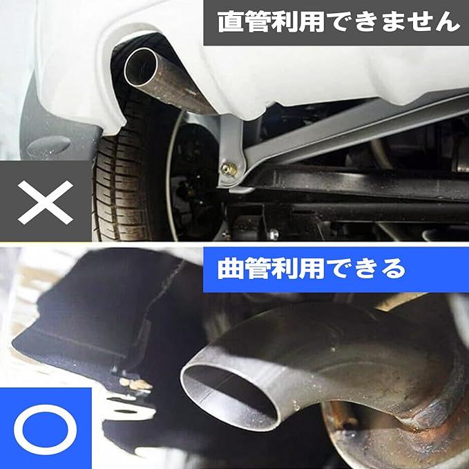 ボルト締め付けタイプで取り付けも簡単。取り付け可能な管外径は38mmから53mmです。必ずお車のマフラー形状をご確認ください。