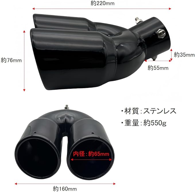 マフラーカッター 汎用 軽自動車 乗用車 車 ドレスアップ 下向きマフラー用 2本出し カスタムパーツ DIY 車外装パーツ カー用品 初心者 改造 簡単取り付け ステンレス製 (ブラック)