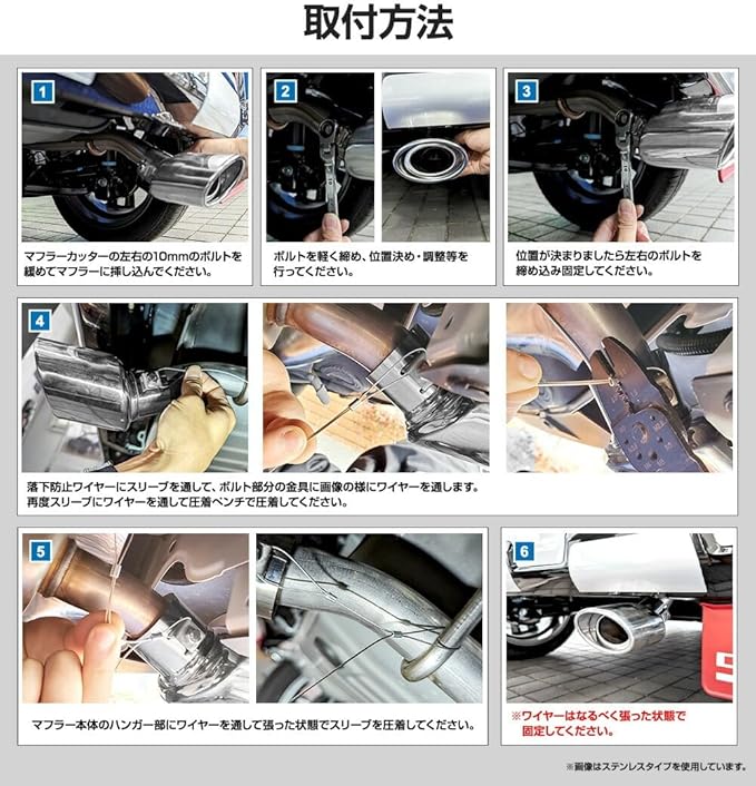 【安心の設計&車検対応】 落下防止用のワイヤー&パーツ付きで走行中の脱落を防止。 マフラーカッター本体は車体全長より内側に収まる設計で、日本の車検にも対応しています。