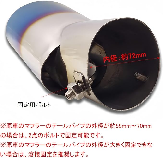 原車のマフラーのテールパイプの外径が約55mm~70mmの場合は、2点のボルトで固定可能です。