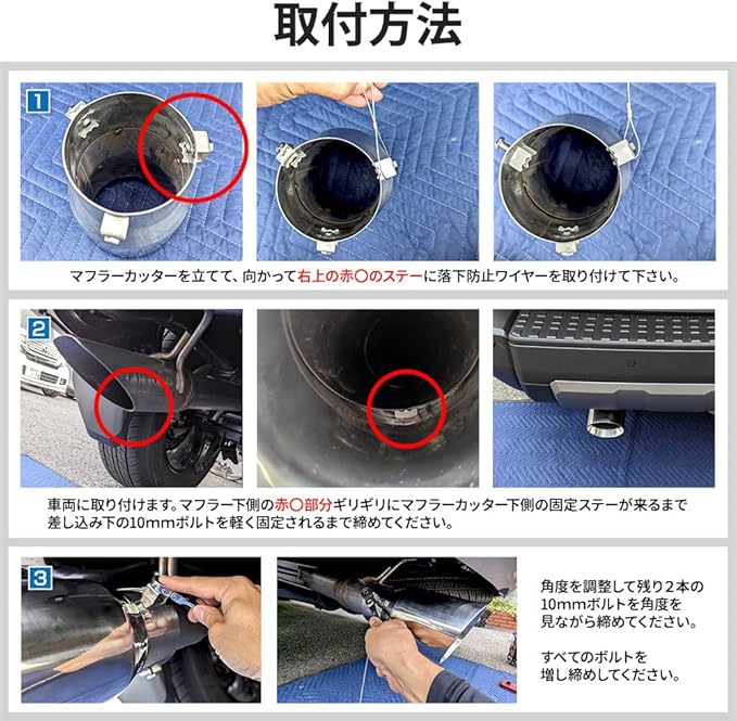 【工具があれば簡単取り付け、加工不要】 10mmスパナと圧着ペンチがあれば、ボルト3本で純正マフラーに装着するだけ。特別な加工は一切不要で、DIY初心者でも安心して取り付けられます。