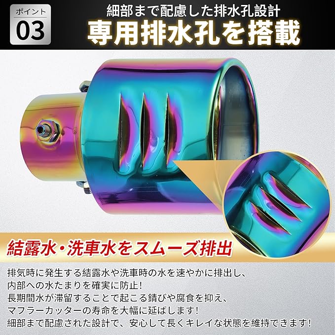 【排 水穴付き 排気管の寿命を延ばす機能設計】底部に専用排 水穴を設けることで、排気管内に溜まる結露水や洗車時の残水をスムーズに排出。内部の腐食や劣化を防ぐだけでなく、排気効率を維持して、エンジンのパワー発揮をサポートする。