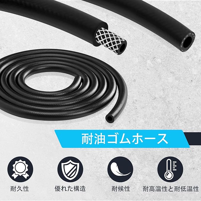【幅広い用途】高性能耐油ホースは、自動車、オートバイ、除雪機、芝刈り機などの油、水、ガソリン、燃料の輸送に広く使用されています。