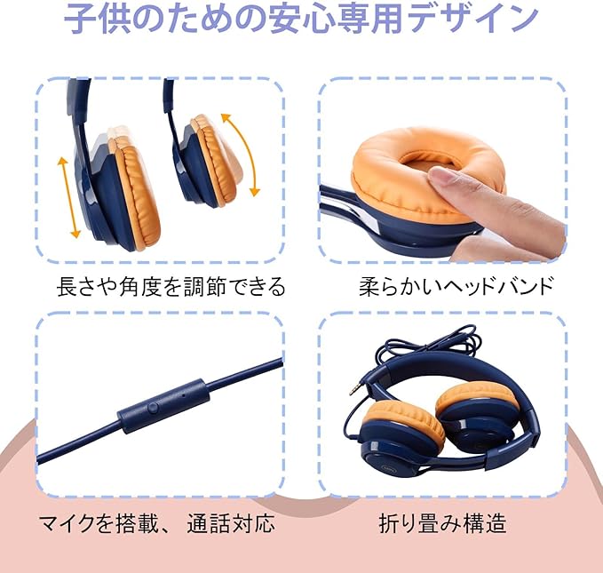 AGPTEK 子供向け ヘッドホン ヘッドフォン マイク付 折りたたみ リモート学習 オンライン授業 有線 安全な音量設定 入学祝い 聴覚保護 遮音 3.5mmオーディオジャック スマートホン ゲーム機 PCなど適用 収納ポーチ付け