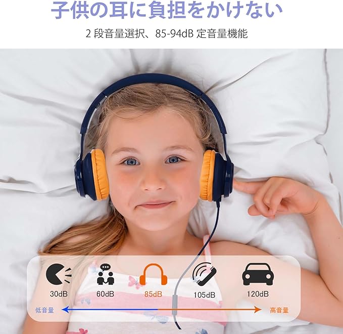【音量制限】世界保健機関によると、85デシベルを超える音量で8時間、100デシベルを超える音量で15分間を超えてリスニングを続けた場合、耳の機能を損傷する可能性があるとしています。その予防に役立つのが音量制限機能。こちらキッズ向けヘッドホンは耳への影響を軽減し、85dB未満になるようになっています。ノイズキャンセリング機能は周囲の音を低減する効果があるため、小さい音量でも満足に音を聞くことができ、難聴対策になります。(音量全体を抑制するタイプですので、音量が下げられてしまうため、大人にとっては小さい音が聞き取りづらくなります。)