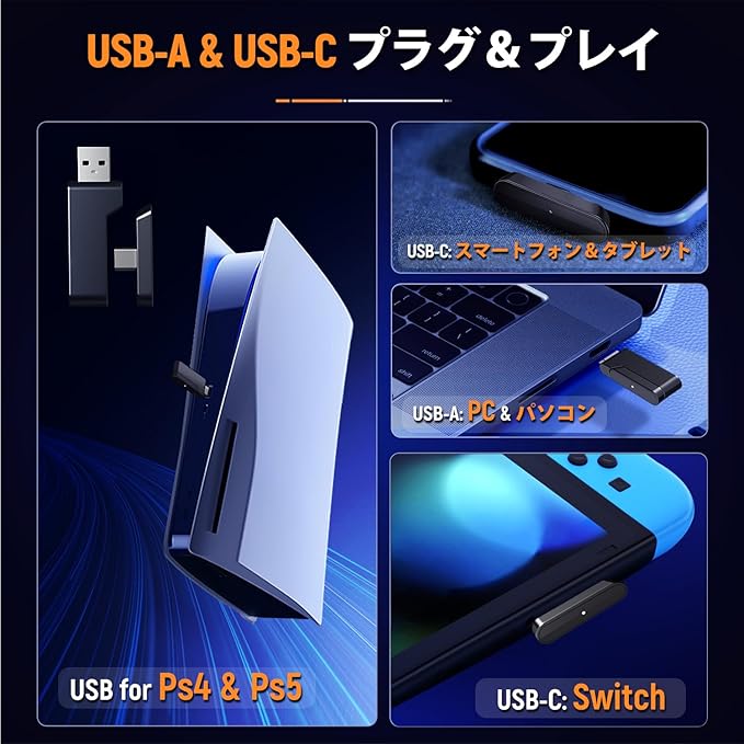 ⚠️2 in 1 USBトランスミッターは、PS5、PS4、PC、ラップトップと一つのユニットに接続する必要がある。