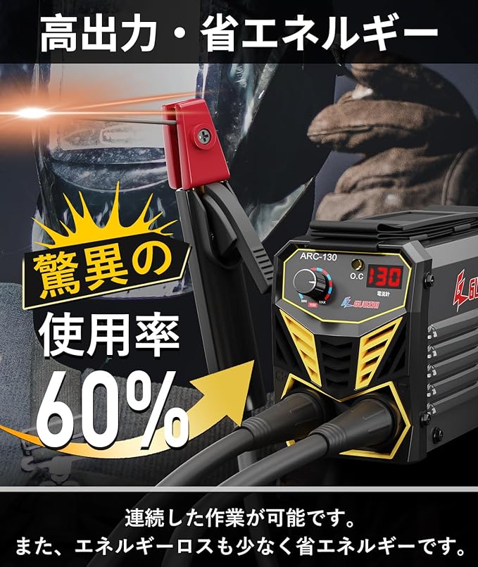 【溶接の初心者に向け】:電流デジタル表示が90-130を示し、ホットスタート機能により、迅速にアークが起こせます。新しい溶接機やユーザーにとっても簡単に作業できます。