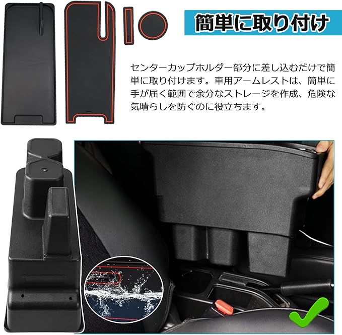 4.【ジムニー収納には最適】:ジムニー専用アームレスト*1、内部トレイ*1、マット*3。肘掛けとしてだけではなく、傘や水、コインや鍵などを入れる大容量収納ケースとして使え、車内をキレイに!さらに、実用性と快適性を両立させており、お手軽いに想像以上のドレスアップ効果をもたらします。