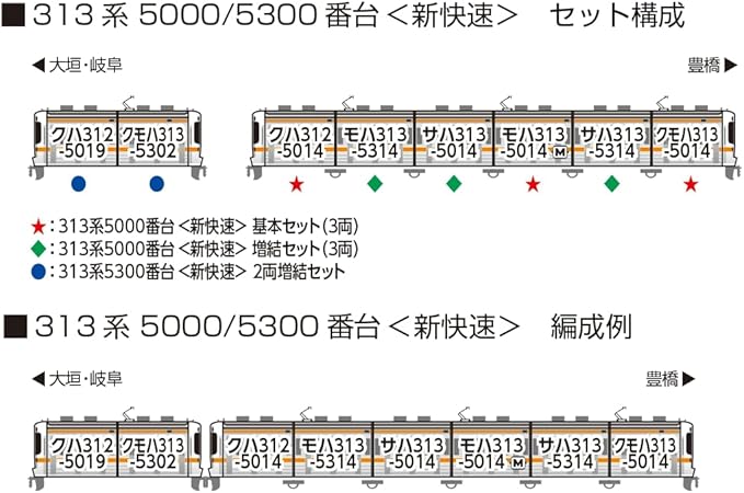 中京圏をメインに活躍する313系5000/5300番台[新快速]を所属表記の省略などが行われた現在の仕様にアップデートして製品化。