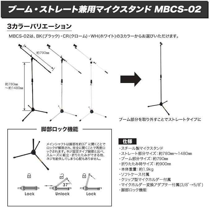 ブーム部分は角度や長さの調整が可能で、ボーカル用・アコギ集音マイク用・アンプマイキング用など様々な用途にご使用いただけます。また、ブーム部分を取り外すことでストレートタイプマイクスタンドとしても使用可能。