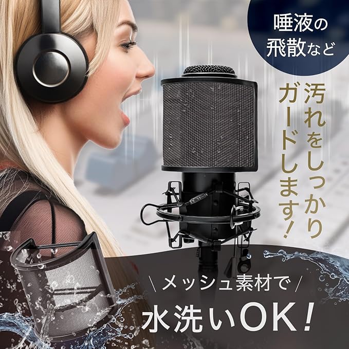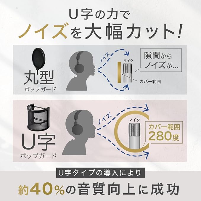 【高いノイズカット性能】既存のU型ポップガードにさらにスポンジ層を搭載したことで、よりノイズカットが可能になりました。従来比で40%もの性能がアップしています。