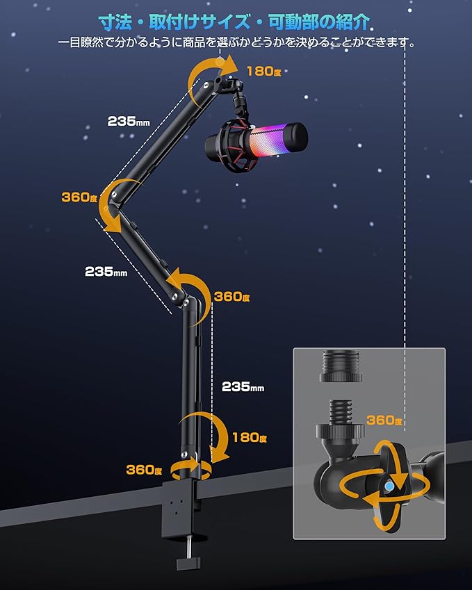 【可動域が広く、角度自由調整】本製品は8つ関節があり、可動領域が広いのスタンドとして、お好みの向き、高さを調節することができます。どんなに曲げでも安心してご利用いただけます。デスクを広く使ったり、マイクを見やすい位置に移動できたり、作業効率が上がります。折りたたみ式で、省スペースと実用性アップ! 収録、動画配信、生配信、オンライン授業、カラオケ、ギター、ドラム、ピアノ、宅録などに大活躍です。